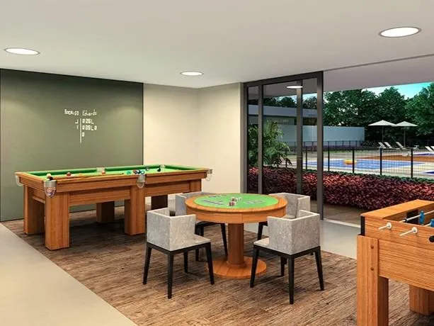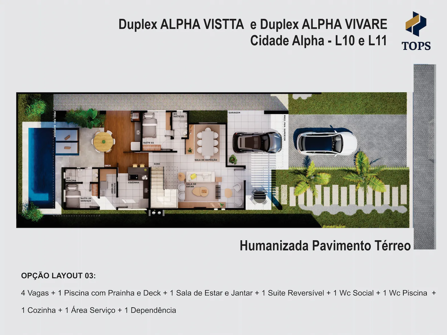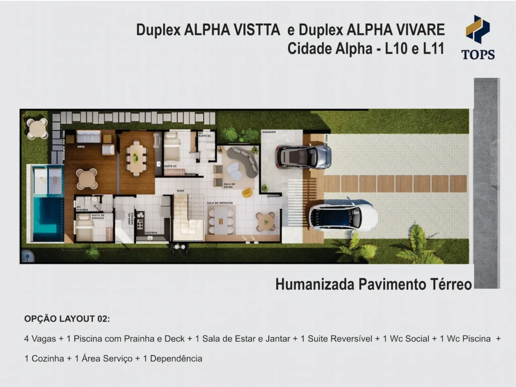 Pav. Inferior Layout 2: 4 Vagas | 1 Sala de Estar e Jantar | 1 Suite Reversível | 1 Wc Social | 1 Cozinha | 1 Área de Serviço | 1 Deck com piscina (opcional)